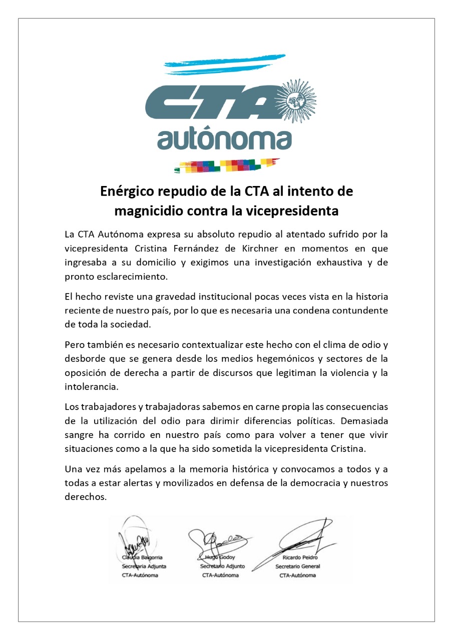 🔵La CTA Autónoma fue otra de las centrales sindicales que se expresó en repudio al atentado sufrido por la vicepresidenta de la nación, Cristina Fernández de Kirchner🔴