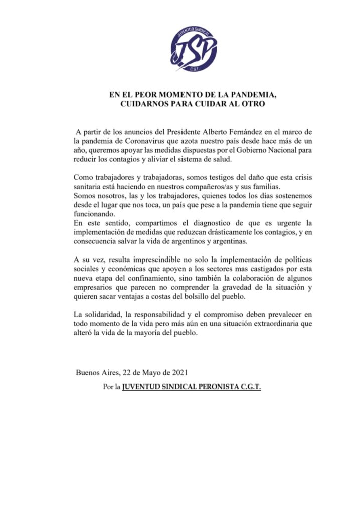 La Juventud Sindical de la CGT aprovechó las nuevas medidas de restriccion impuestas por el Gobierno Nacional ante el avance de los contagios en la Argentina para apoyar al Presidente de la Nación pero además, para elevar un directo hacia el empresariado.