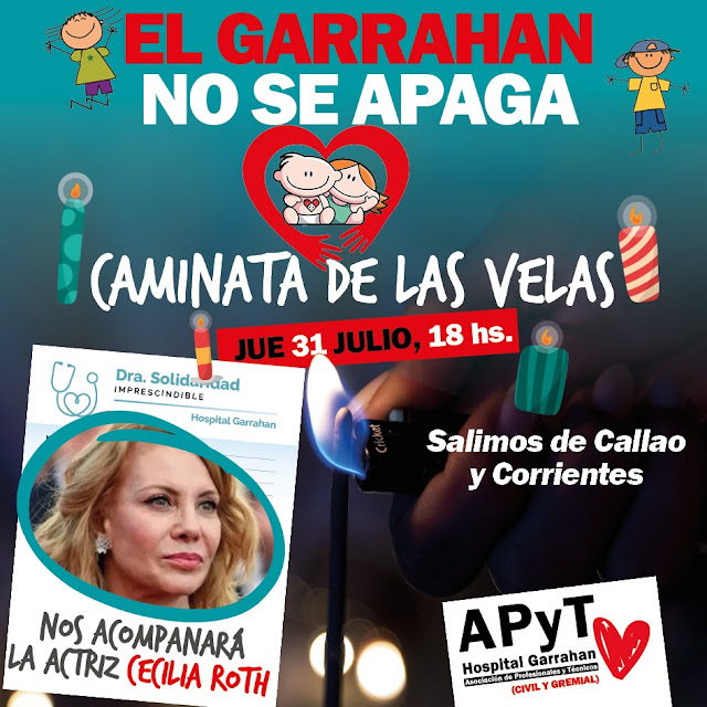 Este jueves, a las 18, trabajadoras y trabajadores del Hospital Garrahan realizarán la denominada “Caminata de las Velas”, desde Corrientes y Callao hasta el Obelisco, bajo la consigna “El Garrahan no se apaga”. La actividad, convocada por la Asociación de Profesionales y Técnicos –ApyT-, incluirá intervenciones artísticas y un cierre con la lectura de una carta abierta a la comunidad a cargo de la actriz Cecilia Roth.