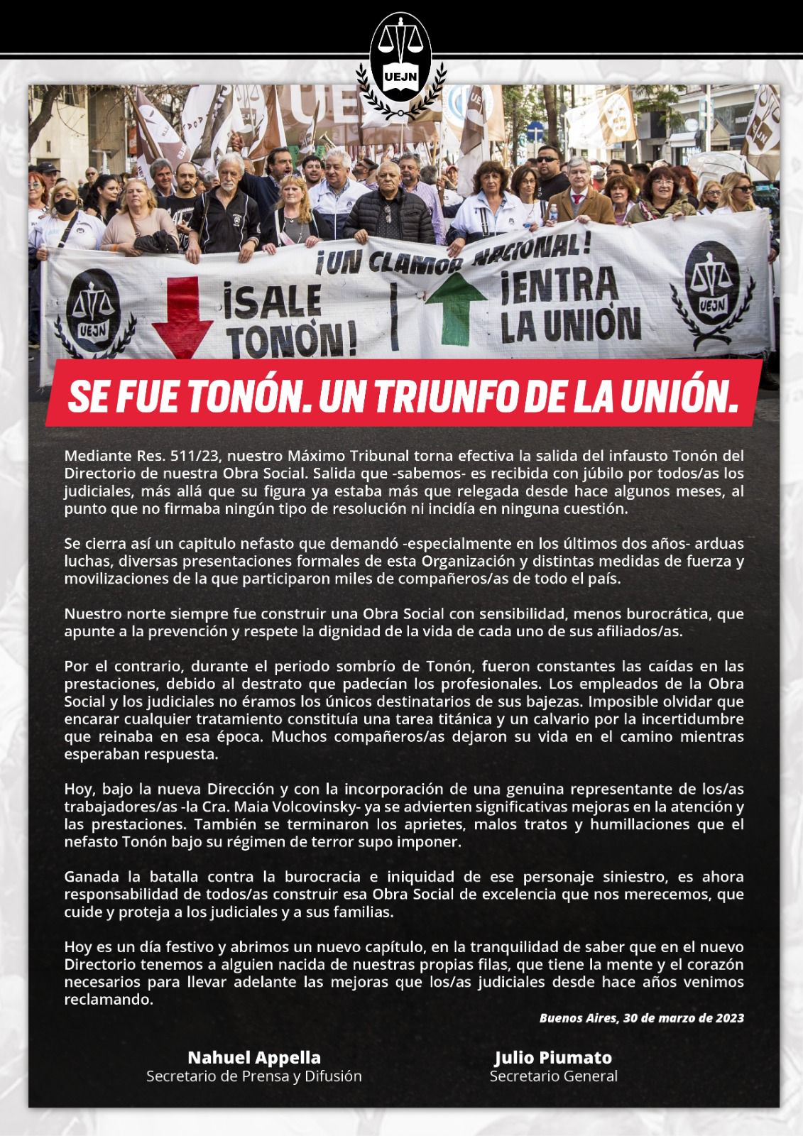 La figura de Tonón fue siempre cuestionada por el gremio de Julio Piumato, quien inició un proceso de pedido de renuncia casi que incesante. La UEJN ya había logrado incorporar a Maia Volcovinsky al directorio de la OSPJN, hecho que fue catalogado como uno de los grandes hitos de la lucha judicial de los últimos tiempos.