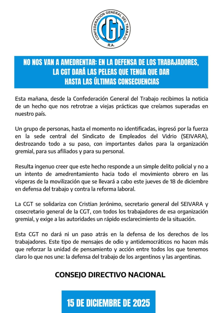 La CGT repudió el violento ataque sufrido a la sede central del SEIVARA y advirtió que se trata de un hecho grave que remite a prácticas que se creían superadas y que afectó directamente a la organización gremial, a sus afiliados y a sus trabajadores.