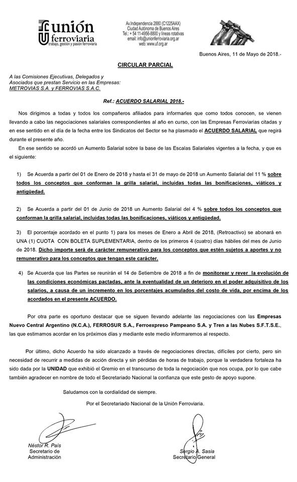 En el día de hoy la el gremio conducido por Sergio Sasia, informó el cierre del acuerdo salarial correspondiente al 2018 con la empresa Metrovias S.A y Ferrovias S.A.C. En este sentido el sindicato cerró un Aumento Salarial 15% en 2 cuotas con una clausula de revisión en Septiembre, sobre el eventual deterioro del poder adquisitivo de los salarios a causa costo de vida acumulado.