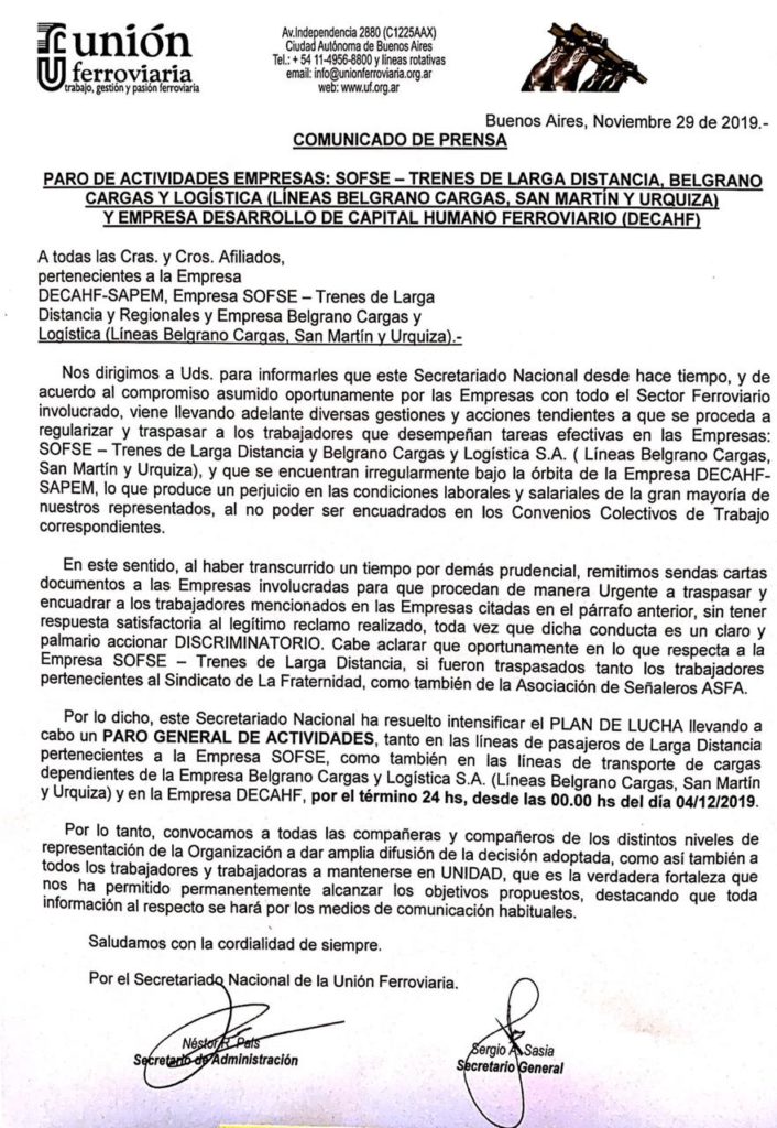 La Unión Ferroviaria anunció un paro general de actividades en las líneas de pasajeros de larga distancia pertenecientes a la empresa SOFSE y en la de las de Carga que dependen de la firma “Belgrano Cargas Logística SA” y en DECAHF-SAPEM por 24 horas, el próximo 4 de diciembre, a raíz del empecinamiento de las compañías mencionadas de no traspasar a los trabajadores y trabajadoras y encuadrarlos bajo su correspondiente Convenio Colectivo, lo que tildó de una “conducta discriminatoria”.