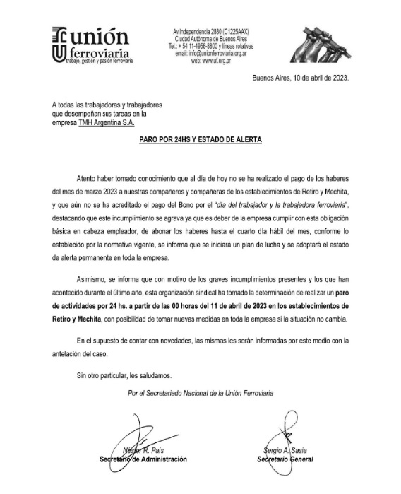La Unión Ferroviaria lanzó un paro de 24 horas y el Estado de Alerta permanente ante la falta de pago de los haberes del mes de marzo de los trabajadores de los establecimientos de Retiro y Mechita. A lo que también se le suma el incumplimiento en el pago del bono de día del trabajador ferroviario.
