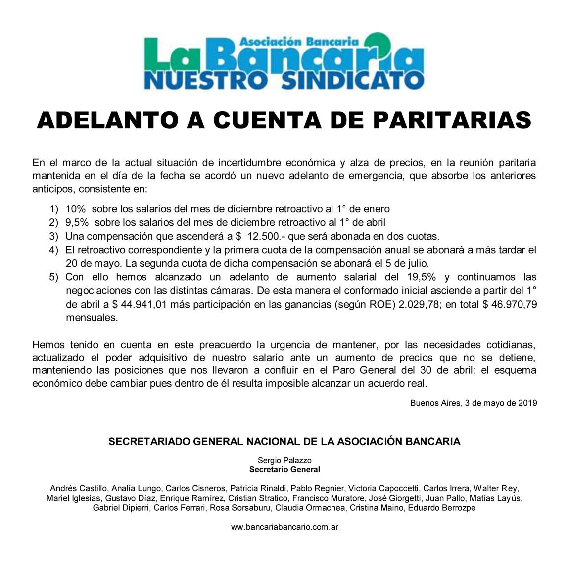 Con ello hemos alcanzado un adelanto de aumento salarial del 19,5% y continuamos las negociaciones con las distintas cámaras. De esta manera el conformado inicial asciende a partir del 1° de abril a $ 44.941,01 más participación en las ganancias (según ROE) 2.029,78; en total $ 46.970,79 mensuales.