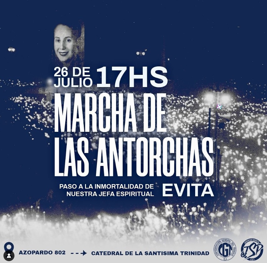 Centenares de jóvenes y militantes peronistas se concentraran este viernes 26 de julio, a las 17 horas, en la puerta de la Confederación General del Trabajo, lugar que eligió la propia Evita para su descanso eterno, ubicada en Azopardo 802, y desde allí comenzaran una peregrinación, vestida de antorchas, cargada de proselitismo y mística, que culminará en la Catedral de la Santísima Trinidad.