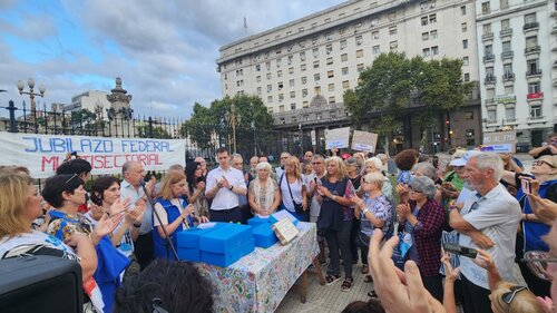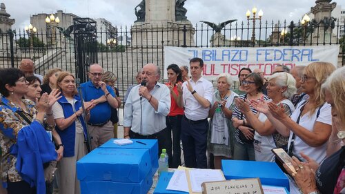 Junto a la secretaria de Seguridad Social de la CTA-T, Sandra Zapatero, la secretaria de Jubilaciones del SUTEBA, Fátima Prieto, y la secretaria de Jubilación y Seguridad Social de UTE-CTERA, Alicia Tantardini, la secretaria de Previsión Social de la CTA-A, Olivia Ruiz, detalló la procedencia de las firmas. Mientras que Luis Rivadeneira, integrante de Jubilados Porteños de La Cámpora, agradeció a todos y a cada uno la enorme tarea de recolectar las firmas.