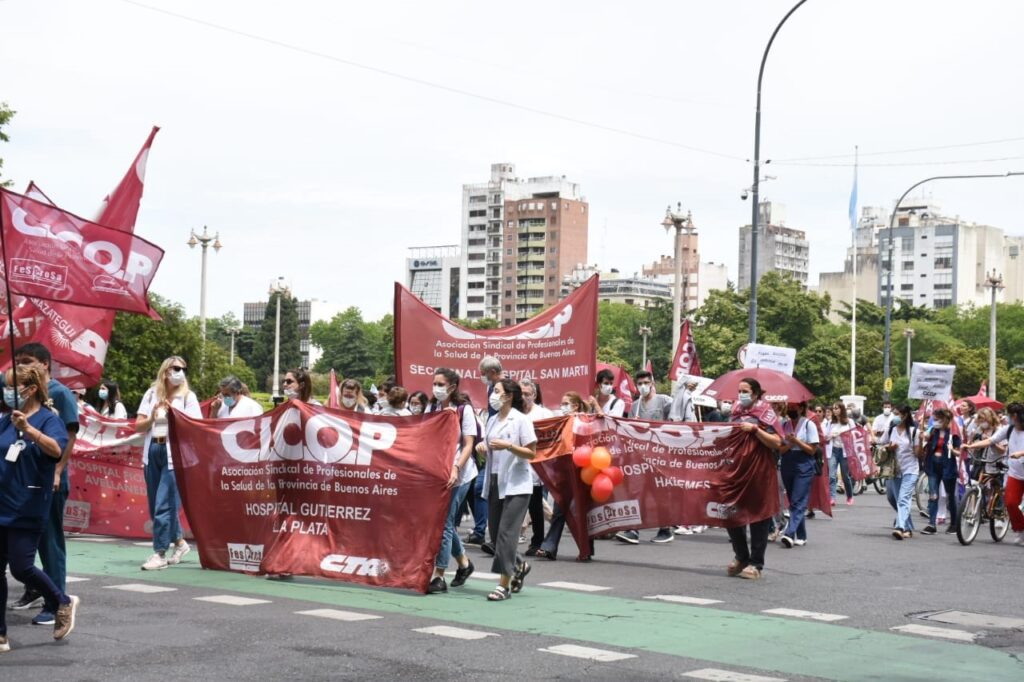 La Asociación Sindical de Profesionales de la Salud movilizó en la ciudad de La Plata y mantiene un paro de 24 horas como medida de fuerza en contra del aumento por decreto instaurado por el Gobierno provincial.