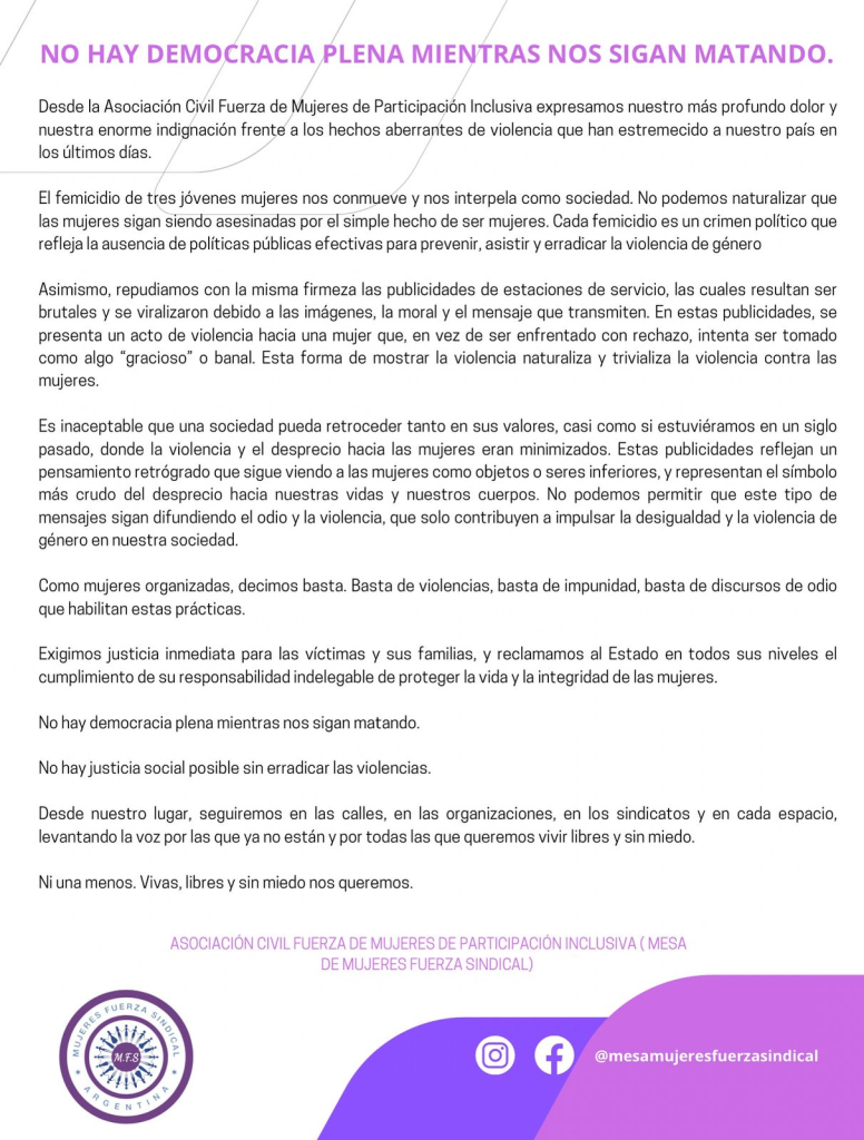 El comunicado remarcó: “No podemos naturalizar que las mujeres sigan siendo asesinadas por el simple hecho de ser mujeres”. Asimismo, las sindicalistas repudiaron “las publicidades de estaciones de servicio, las cuales resultan ser brutales y se viralizaron debido a las imágenes, la moral y el mensaje que transmiten”, en relación a la locura publicitaria creada desde una gasolineria Shell, en Entre Ríos, en la cual se veía a los playeras envolver en una bolsa a una compañera de trabajo. Según denunciaron, este tipo de mensajes terminan por banalizar y trivializar la violencia contra las mujeres.