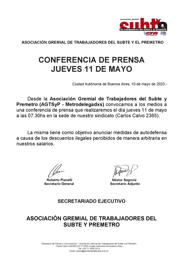 El hecho se dará efectivo «si la empresa Metrovías-EMOVA no devuelve para este viernes 12 de mayo los salarios descontados ilegalmente». «Los trabajadores continuaremos con el plan de lucha exigiendo la desabestización integral de la red y la reducción de la jornada realizando este próximo lunes 15 medidas de fuerza que afectarán y paralizarán las 6 líneas de subterráneo y el Premetro si la empresa no devuelve para este viernes 12 los salarios descontados ilegalmente», subrayaron en un comunicado de prensa.