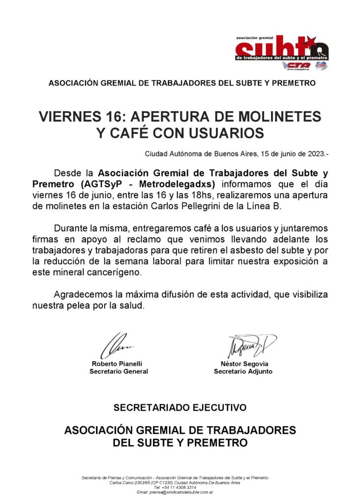 «Como continuidad de nuestro plan de lucha exigiendo la desabestización de la red de subterráneos y la reducción de la jornada laboral, los trabajadores del subte realizaremos este viernes 16 de junio una jornada de difusión con liberación de accesos en la estación Carlos Pellegrini de la línea B a partir de las 16», indicó el comunicado de AGTSyP.