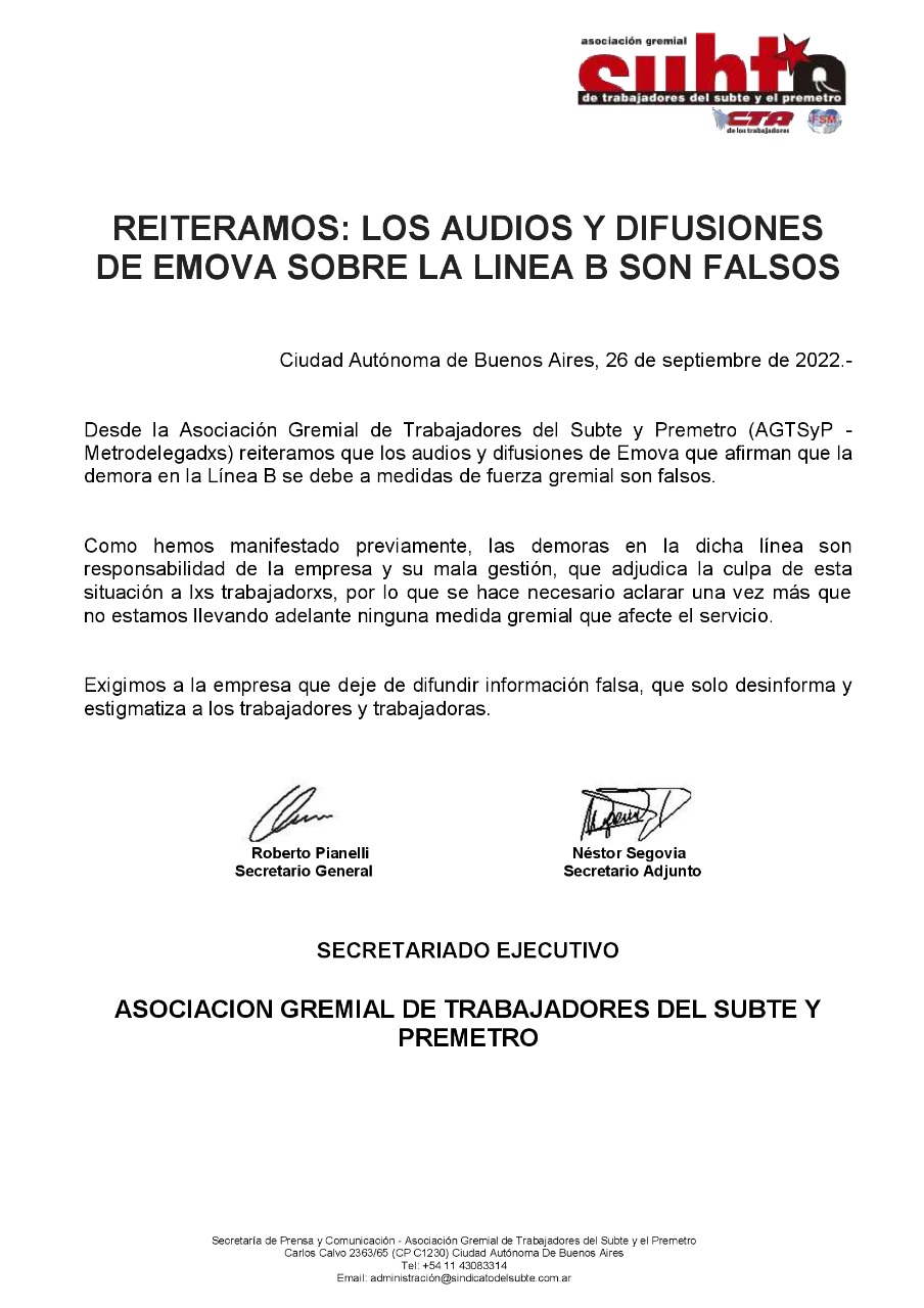 Los Metrodelegados se refirieron a los anuncios de Emova sobre las demoras en la Línea B y su relación a medidas sindicales. “Son falsos”, aseguran desde la AGTSyP, que conduce Roberto Pianeli.