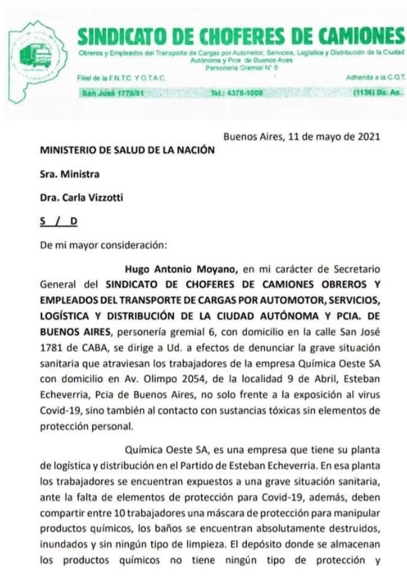 Hugo Moyano, Secretario General del Sindicato de Camioneros, preocupado por la grave situación sanitaria que atraviesan los trabajadores de la Empresa Química Oeste S.A. envío un documento a la Ministra de Salud de La Nación, Carla Vizzotti, denunciando las condiciones en las que trabajan día a día los empleados de la empresa.