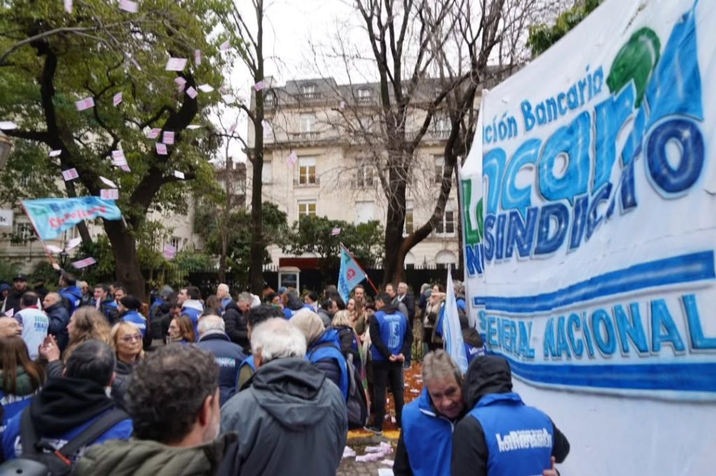 En la jornada de hoy, la Asociación Bancaria realizó una multitudinaria marcha hacia la Embajada de España, para exigir su intervención concreta frente a los abusos y atropellos del Banco Santander contra los derechos de las trabajadoras y los trabajadores bancarios.