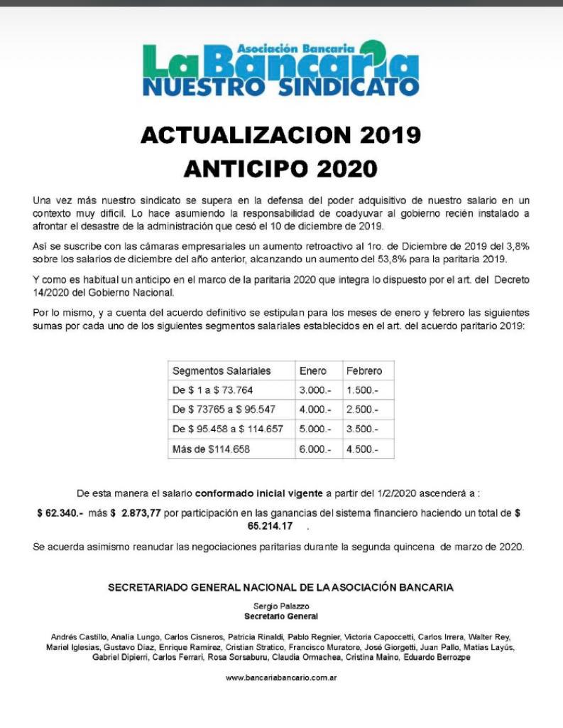 Según se desprende de un comunicado emitido por el gremio que líder Sergio Palazzo, «se suscribe con las cámaras empresariales un aumento retroactivo al primero de diciembre de 2019 del 3,8% sobre los salarios de diciembre del año anterior, alcanzando un incremento del 53,8% para la paritaria 2019». El salario conformado inicial vigente ascenderá a $62.340 más $2.873,77 por participación en las ganancias del sistema financiero, lo que llevaría a un total de $65.214.17.