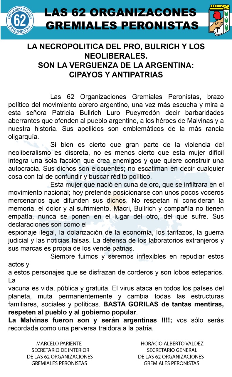 🔵Las 62 Organizaciones Peronistas, liderada por el vidriero Horacio Valdez, emitió una contundente comunicación ante los dichos de Patricia Bullrich🔴