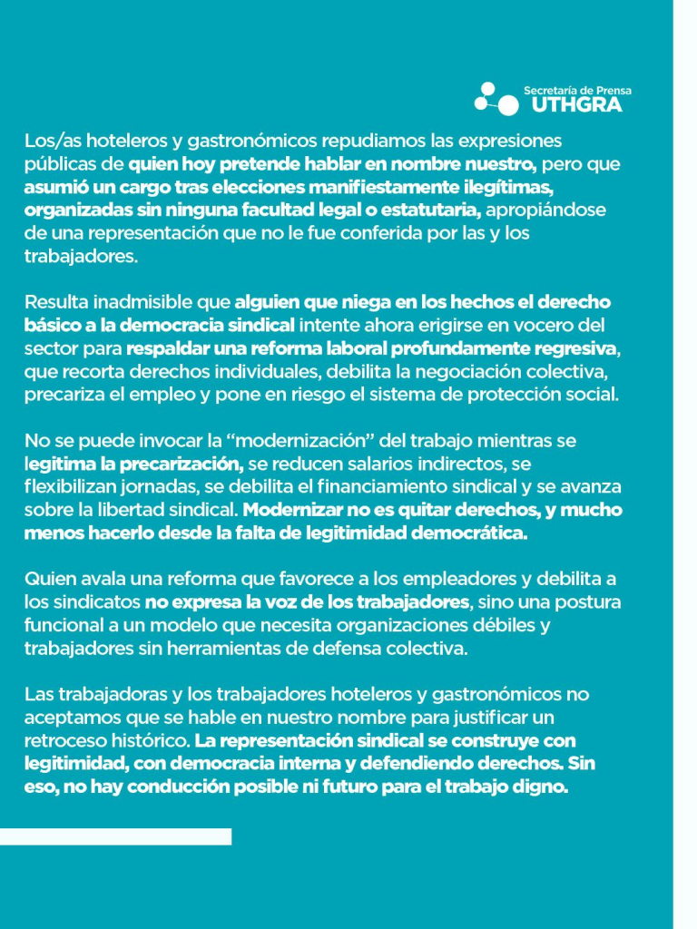 El duro comunicado de UTHGRA rechaza de manera categórica la reforma laboral, a la que define como “profundamente regresiva”, y advierte que recorta derechos individuales, debilita la negociación colectiva, precariza el empleo y pone en riesgo el sistema de protección social. Además, cuestiona el uso del concepto de “modernización” para justificar la flexibilización laboral, la reducción de salarios indirectos y el debilitamiento del financiamiento sindical y de la libertad sindical.