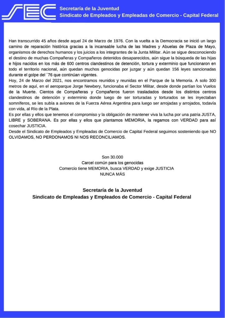 Específicamente dentro de la actividad sindical, los futuros dirigentes mencionaron los datos brindados por la Comisión Provincial por la Memoria. «…el 67% de las personas detenidas desaparecidas eran trabajadores, trabajadoras, delegados, delegadas o activistas sindicales”. “Eso mostraba a las claras como los genocidas buscaban terminar con el movimiento obrero argentino para poder así implementar sus políticas neoliberales”, declararon desde la organización mercantil.