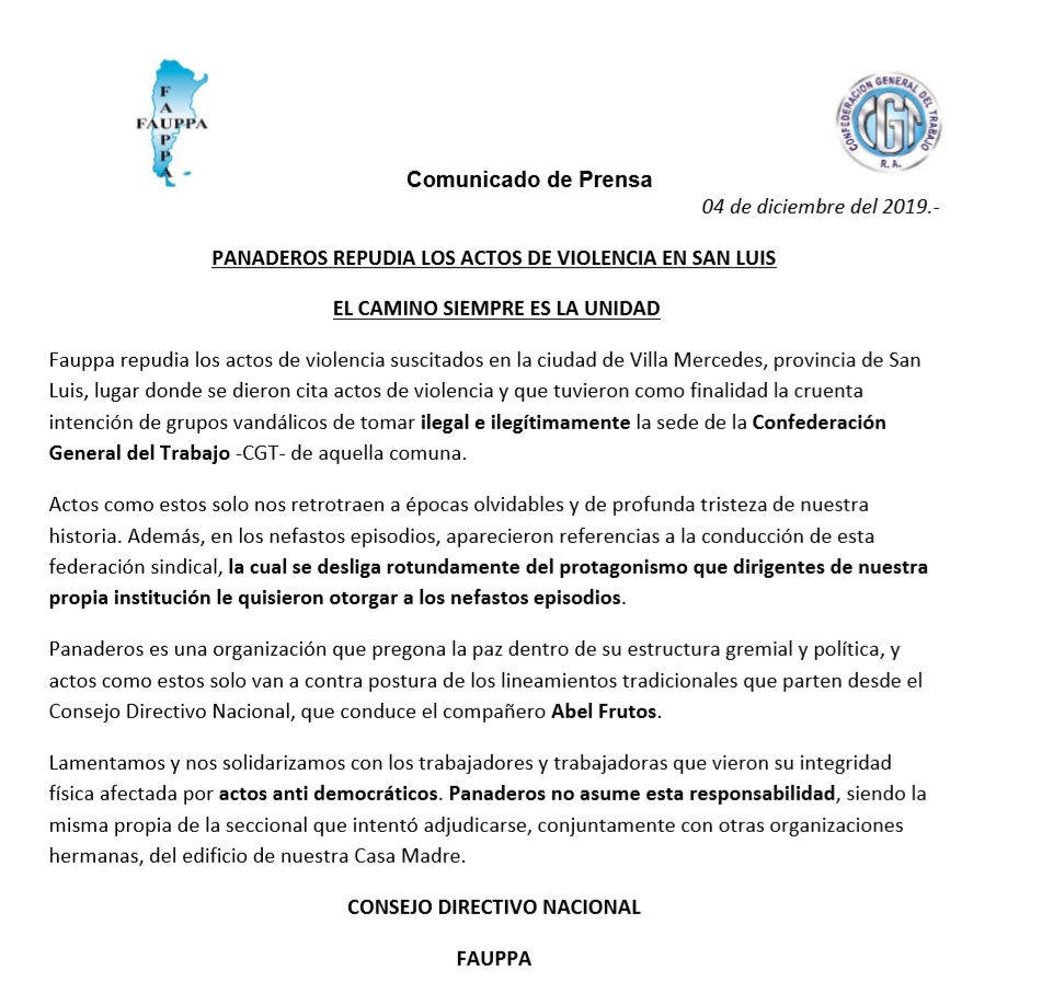 En esta línea, Frutos se desprendió tildando de “cruenta” la “intención de grupos vandálicos de tomar ilegal e ilegítimamente la sede de la Confederación General del Trabajo –CGT”. “Panaderos no asume esta responsabilidad, siendo la misma propia de la seccional que intentó adjudicarse, conjuntamente con otras organizaciones hermanas, del edificio de nuestra Casa Madre”, expresa el comunicado de prensa firmado por el Consejo Directivo del gremio panadero.