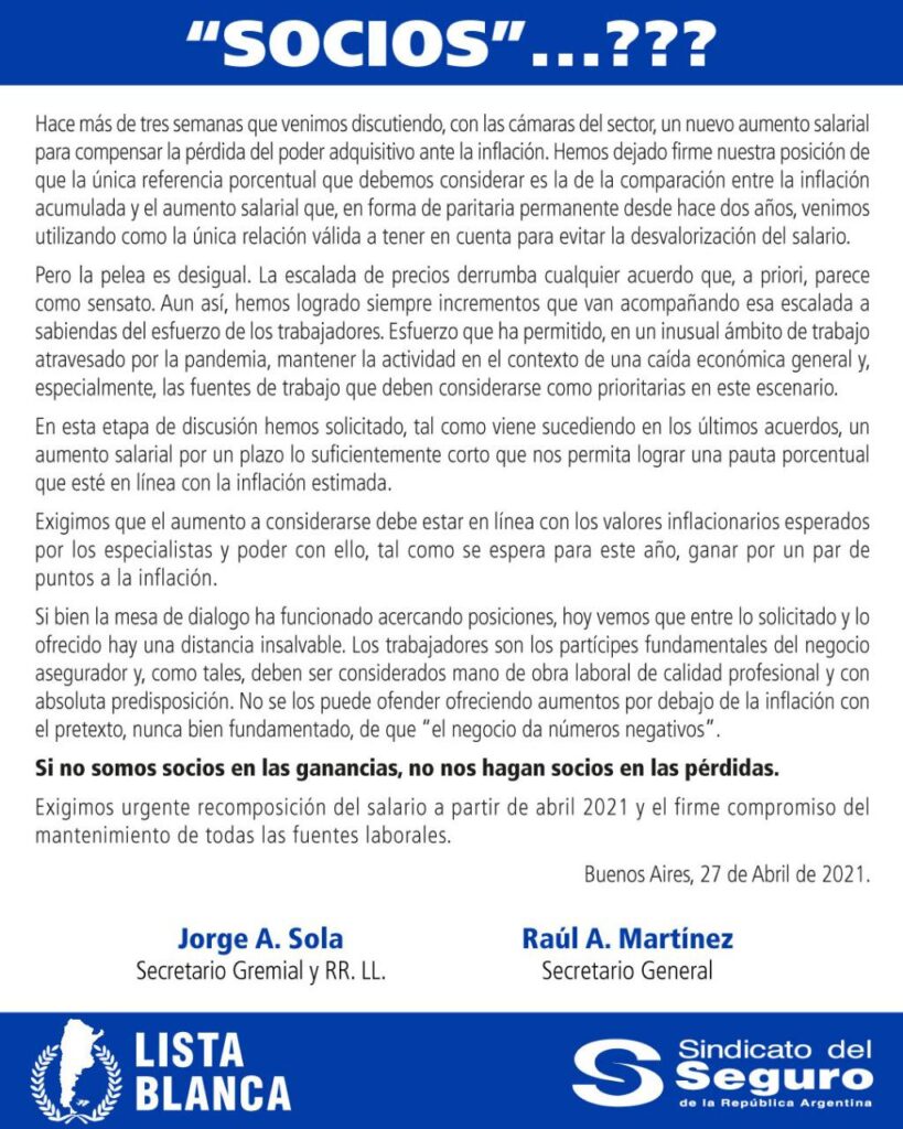 La desvalorización del poder adquisitivo ha alcanzado a un gran porcentaje de los trabajadores argentinos y si bien el gremio del Seguro es una de los que mejor acomoda su paritaria, la inflación lleva al sindicato a acortar cada vez más los plazos de los acuerdos que, en este caso, aun no han sido signados.