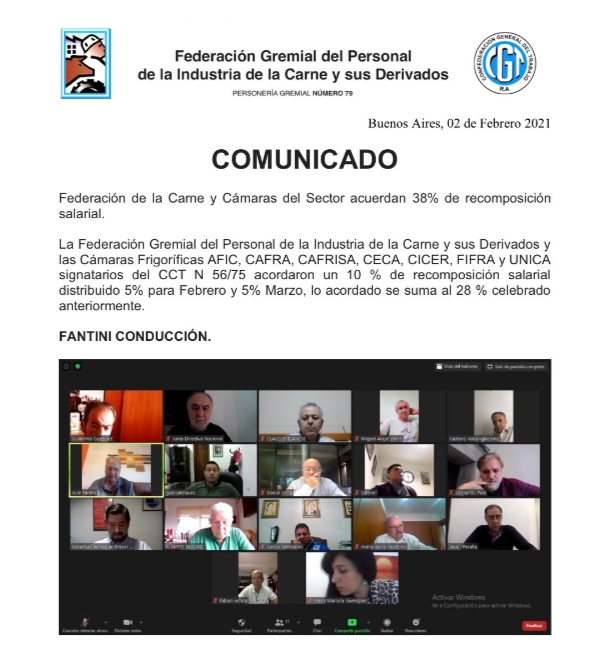 La Federación Gremial del Personal de la Industria de la Carne y sus Derivados logró con las Cámaras Frigoríficas AFIC, CAFRA, CAFRISA, CECA, CICER, FIFRA y UNICA signatarios del CCT 56/75, llegar a un acuerdo paritario para los trabajadores de la Rama de Carne Roja.