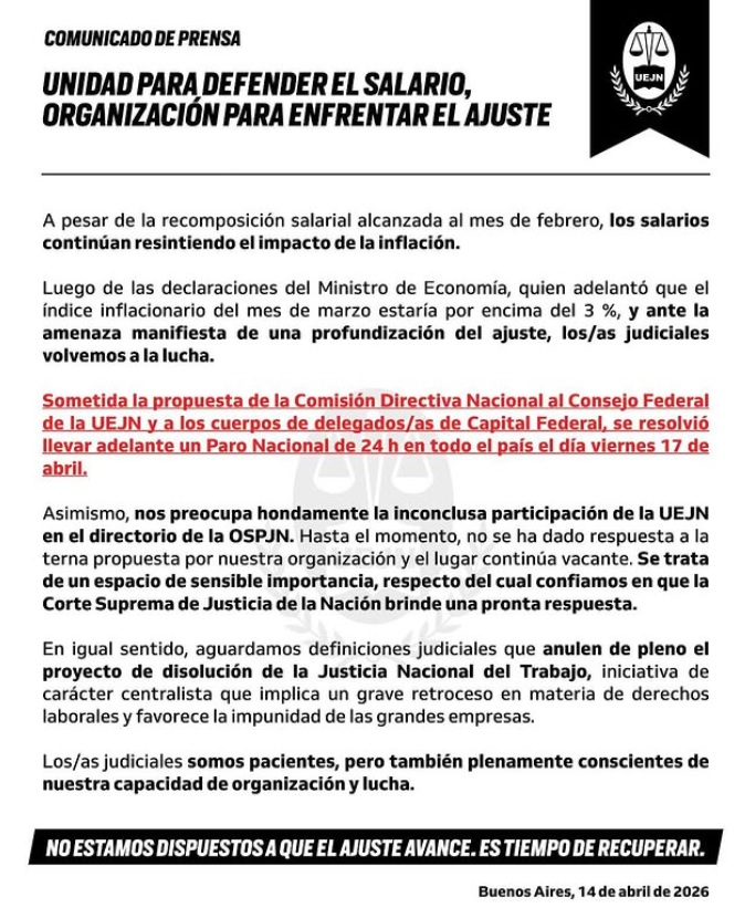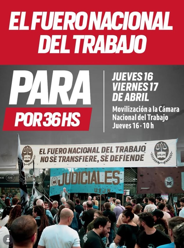 La Unión de Empleados de la Justicia de la Nación (UEJN) lanzó un paro de 36 horas en el Fuero Nacional del Trabajo para este jueves 16 (con movilización) y viernes 17 de abril en rechazóa otro de los puntos críticos señalados por el sindicato: el proyecto de disolución de la Justicia Nacional del Trabajo. En ese sentido, exigieron definiciones judiciales que lo anulen “de pleno”, al considerar que se trata de una iniciativa de carácter centralista que implicaría “un grave retroceso en materia de derechos laborales y favorecería la impunidad de las grandes empresas”.