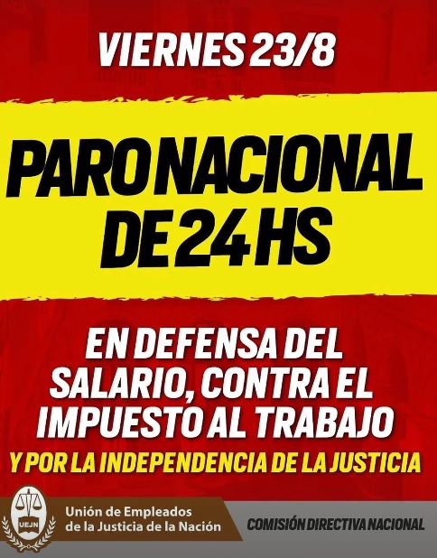 El Secretario General de la Unión de Empleados Judiciales de la Nación (UEJN), Julio Piumato ratificó el paro nacional de 24 hs a lo largo y ancho de todo el país, para este viernes 23 de agosto, durante el banderazo que realizó el gremio en la mañana de hoy, para visibilizar el conflicto y como medida de acción gremial.