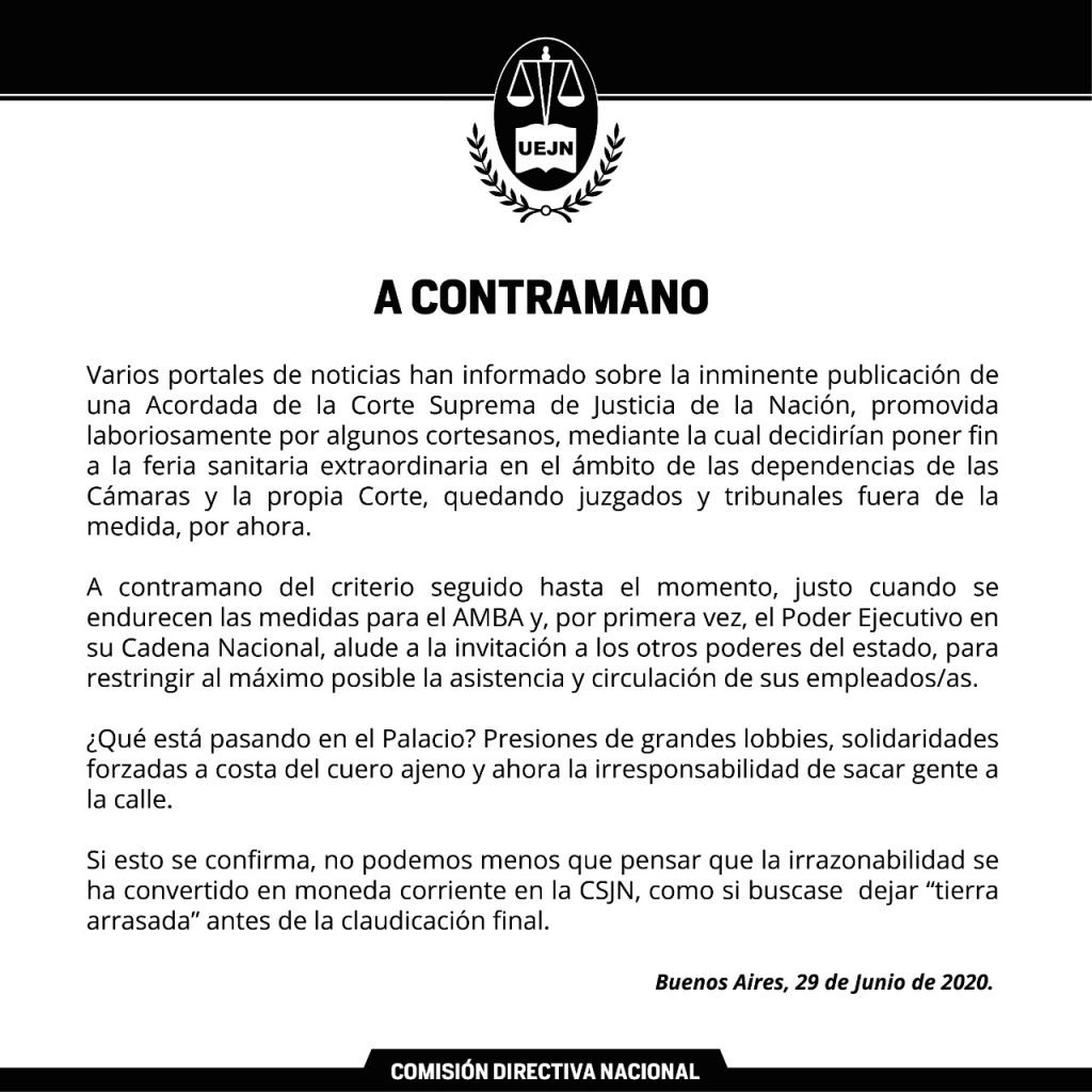 Se denunció un nuevo caso en el Juzgado Laboral 45, de Cerrito 264. Por eso se procedió a la desinfección del edificio mientras el dirigente sindical publicó un comunicado en el que habla de una decisión de la CS de poner fin a la Feria Sanitaria extraordinaria. “¿Qué está pasando en el Palacio? Presiones de grandes lobbies, solidaridades forzadas a costa del cuero ajeno y ahora la irresponsabilidad de sacar gente a la calle”, plantea en el documento titulado: “A contramano”.
