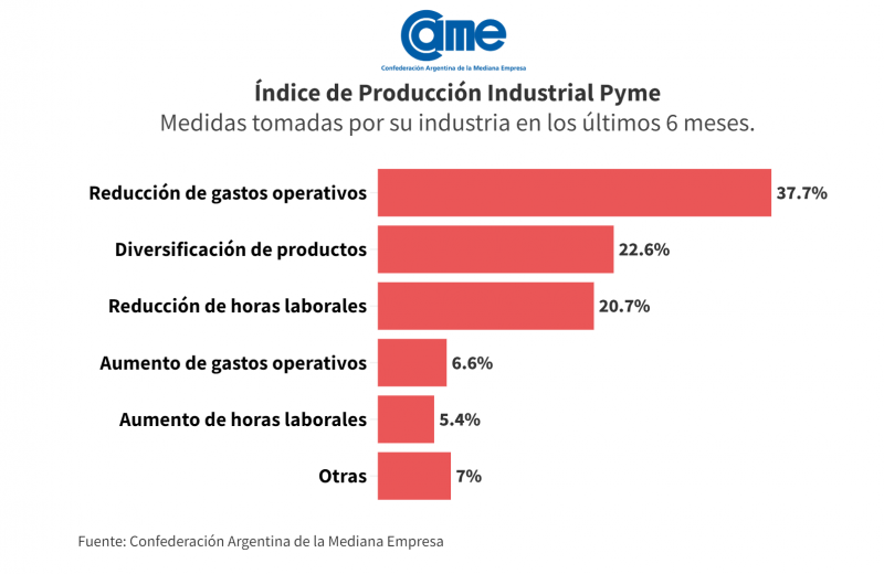 El 37,7% de las empresas han reducido gastos operativos, el 22,6% ha diversificado productos, y el 20,7% ha reducido horas laborales. Sin embargo, el fuerte impacto se dio en las caídas significativas en la producción como Alimentos y Bebidas (cayó un 17,4% anual en junio y un 16,7% en el primer semestre del año); Textiles e Indumentaria (caída del 7,4% anual en junio y del 2,7% en el primer semestre; (Maderas y Muebles (descendió un 20,7% anual en junio y un 18,7% en el primer semestre; Metal, Maquinaria y Equipo, y Material de Transporte (contracción del 20% anual en junio y una caída acumulada del 22,4% en el primer semestre); Químicos y Plásticos (cayó un 30,3% anual en junio y un 27,2% en el primer semestre); Papel e Impresiones (caída del 31,5% anual en junio y del 23,6% en el primer semestre).