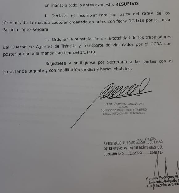 El fallo del Fuero Contencioso en lo Administrativo de la Ciudad, “declara el incumplimiento por parte del CGBA en los términos de la medida cautelar ordenada con fecha del 1/11/19 y ordena la reinstalación de la totalidad de los trabajadores del Cuerpo de Agentes de Tránsito y Transporte desvinculados por el GCBA con posterioridad de la demanda cautelar de dicha fecha”.