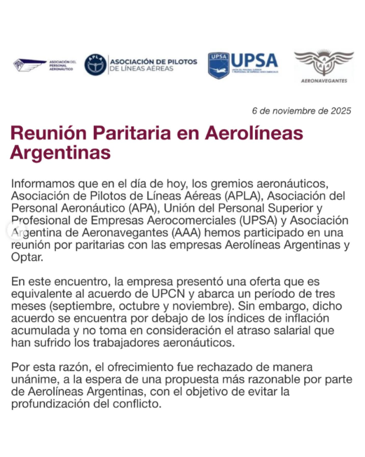 En este contexto, los aeronáuticos quedaron a la espera de una propuesta más razonable por parte de Aerolíneas Argentinas, con el objetivo de evitar la profundización del conflicto.