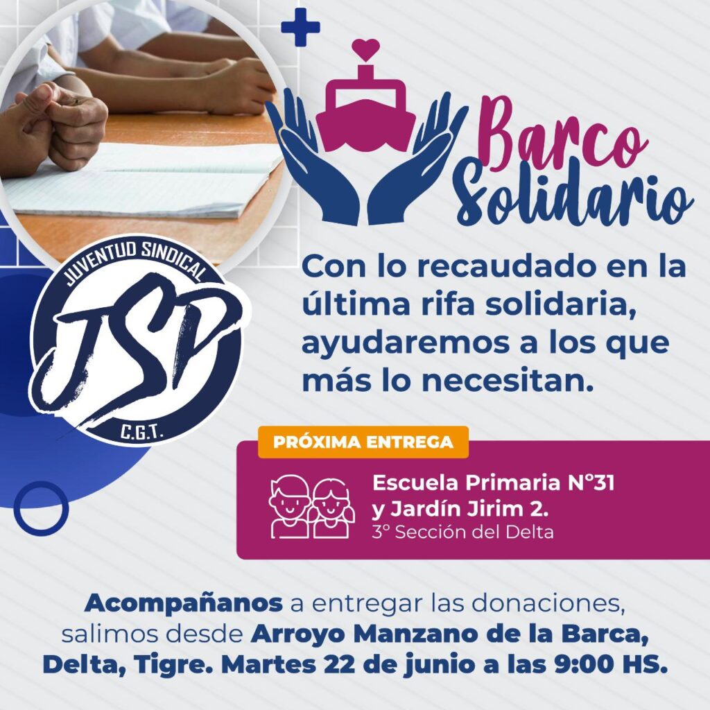 La Juventud Sindical de la CGT encara este martes una movida con pocos precedentes dentro del sindicalismo argentino. Desde las 9 de la mañana, saldrá desde El Delta, en Tigre, un Barco Solidario que llevará alimentos y elementos a la “Escuela primaria 31- Jardín Jirim”, en Arroyo Manzano de la Barca.