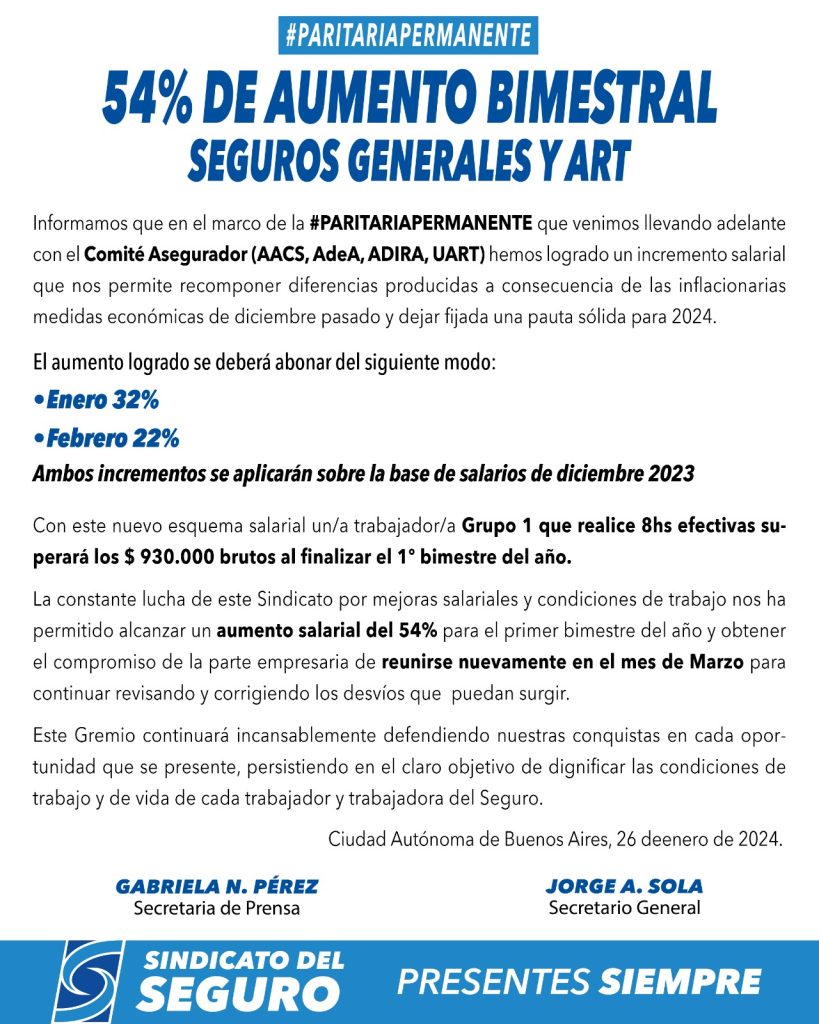 Tras intensas negociaciones entre el Sindicato del Seguro y el Comité Asegurador (AACS, AdeA, ADIRA, UART), la resultante a las exigencias sindicales alcanzan un acuerdo sustancial que resuelve el conflicto salarial que mantenía en vilo a los trabajadores del sector asegurador.