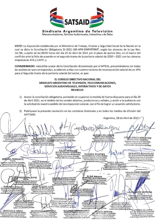 El Consejo Directivo Nacional de SATSAID informó que fueron notificados por “las más altas autoridades del Ministerio de Trabajo de la Nación” que iban a aplicar la conciliación obligatoria en el conflicto paritario. Esto se dio, según consignan, ante la falta de acuerdo entre el gremio y las Cámaras Empresarias, que llevaron a la convocar a las medidas de fuerza anunciadas en canales abiertos, productoras y señales para el jueves 29.