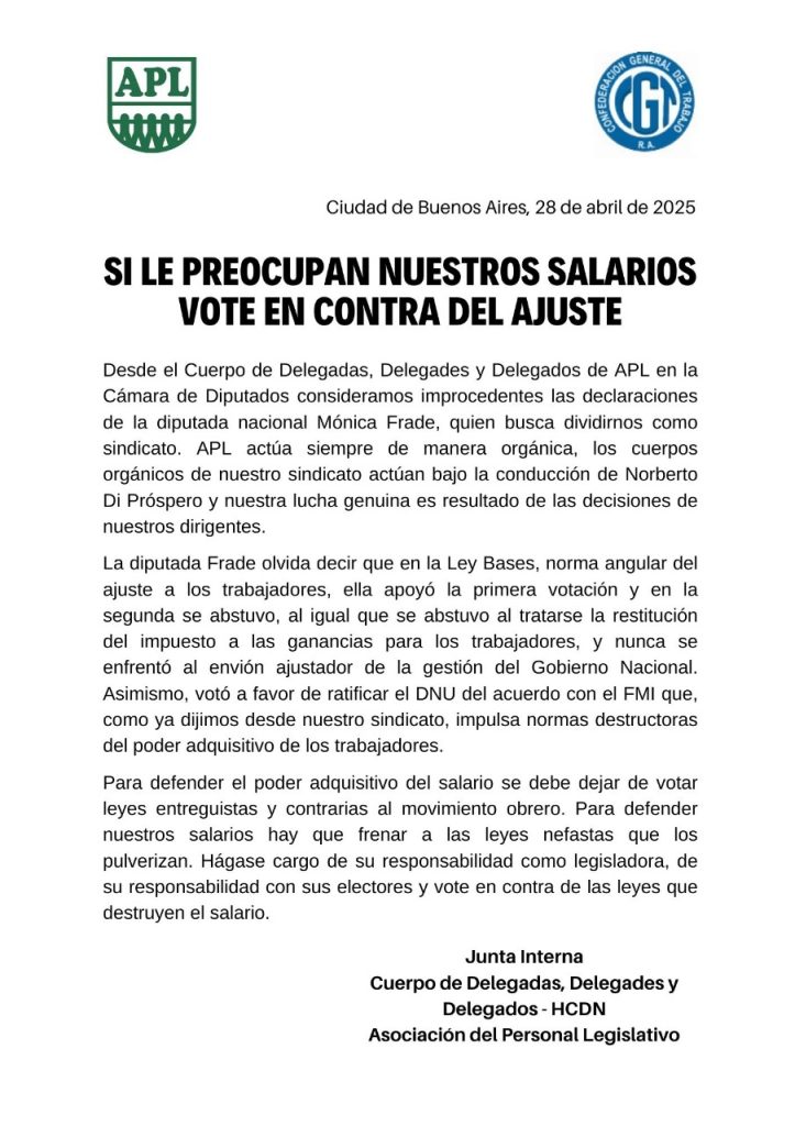 APL no tardó en salir al cruce. Con un comunicado titulado «Si le preocupan nuestros salarios, vote en contra del ajuste«, la organización conducida por Norberto Di Próspero le recordó a Frade varios datos incómodos: votó a favor de la Ley Bases, la cual entre algunas cosas, intenta flexibilizar las relaciones laboroles, posibilitando ajuste y despidos; Se abstuvo cuando se trató la vuelta del impuesto a las ganancias sobre los sueldos y apoyó el acuerdo con el FMI, que también implica recortes.