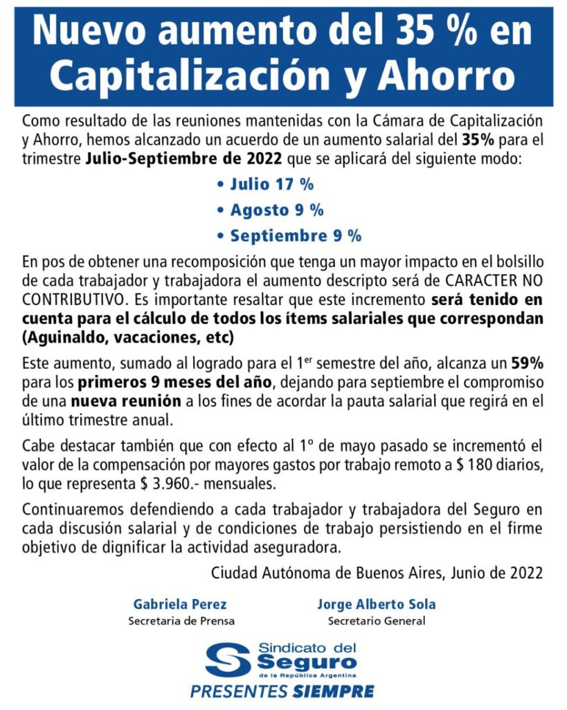 Seguros cerró un nuevo acuerdo paritario en el que en el que por tres meses, la actividad tendrá un 35% en la carrera contra la inflación. El sello fue con la Cámara de Capitalización y Ahorro para el trimestre julio-septiembre y totaliza un 59% por el lapso de 9 meses.