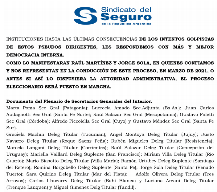 Seguros avanzó y confirmó que ni bien se levante la norma que impide procesos electorales en la pandemia, el gremio se somete a la voluntad de la democracia.
