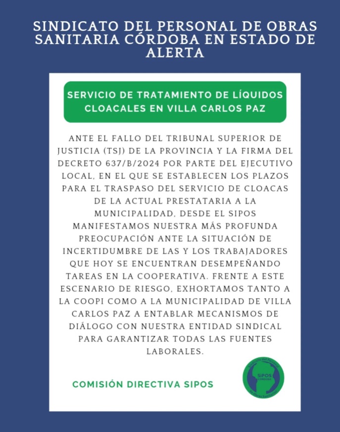 El Sindicato del Personal de Obras Sanitarias de Córdoba (SIPOS) ha declarado un estado de alerta tras el fallo del Tribunal Superior de Justicia (TSJ) de la provincia y la firma del Decreto 637/B/2024 por parte del Ejecutivo local. Esta resolución establece los plazos para el traspaso del servicio de tratamiento de líquidos cloacales de la actual prestadora, una cooperativa, a la Municipalidad de Villa Carlos Paz.