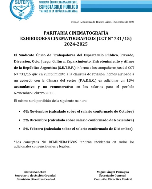 SUTEP logró cerrar un aumento salarial en la paritaria Cinematografía Exhibidores Cinematográfico del periodo noviembre de 2024 – febrero de 2025