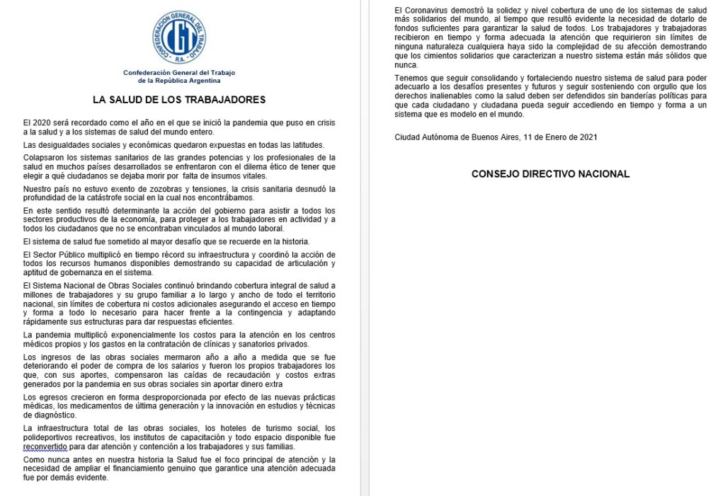 - Para la CGT, la Argentina «no estuvo exenta de zozobras y tensiones por la irrupción de la pandemia, y la crisis sanitaria desnudó la profundidad de la catástrofe social en la que estaba», por «lo que fue determinante la acción del Gobierno para asistir a todos los sectores económicos productivos, y proteger a los trabajadores en actividad y a los ciudadanos que no estaban vinculados al mundo laboral».