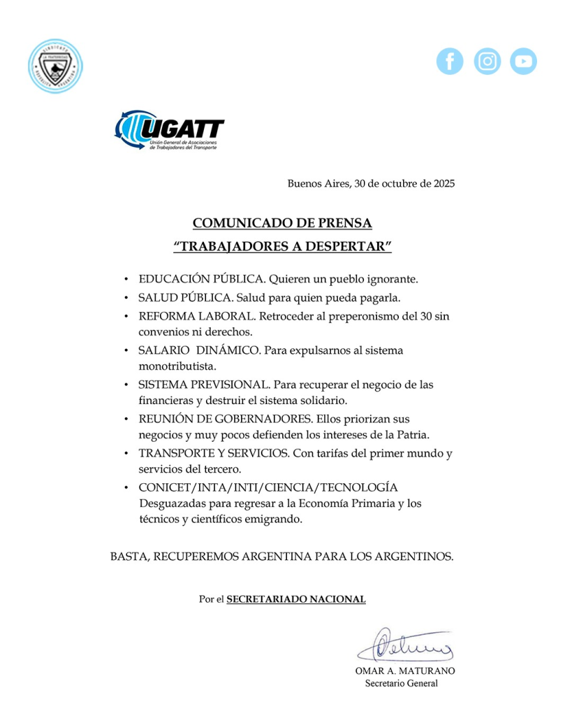 La UGATT, encabezada Omar Maturano, difundió un duro y sugestivo comunicado titulado “Trabajadores a despertar”, en el que cuestiona la reforma laboral que impulsa el Gobierno nacional y alerta sobre un retroceso en los derechos laborales y sociales conquistados.