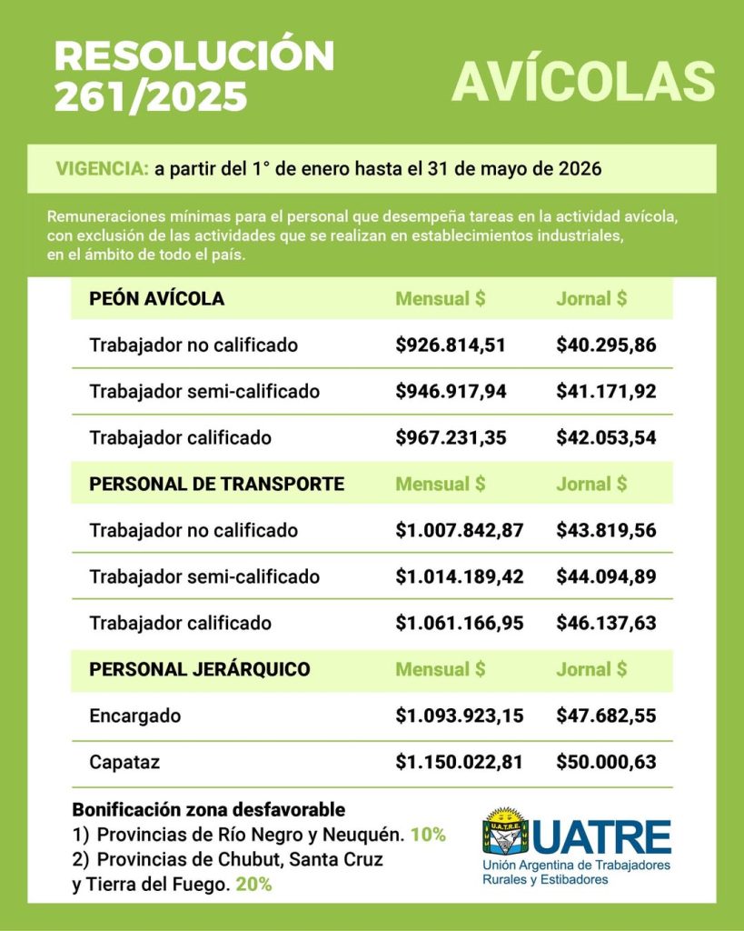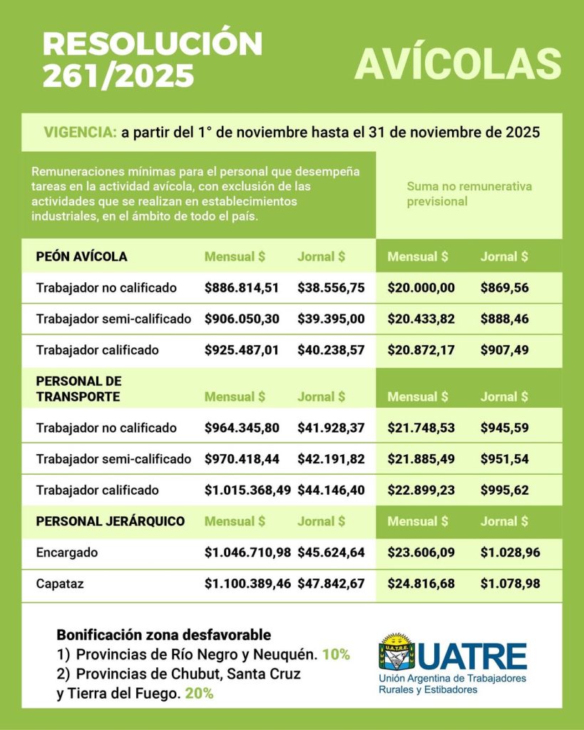 La Unión Argentina de Trabajadores Rurales y Estibadores (UATRE) alcanzó un nuevo acuerdo salarial para los trabajadores y trabajadoras de la actividad avícola en el ámbito de todo el país, a través de la Resolución 261/2025 de la Comisión Nacional de Trabajo Agrario (CNTA).