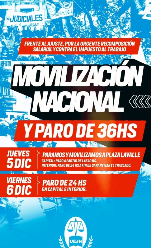 🥁 La movilización de los trabajadores judiciales está tendrá su epicentro en la capital federal a las 10 horas. La columna de la UEJN marchará hacia la Plaza Lavalle, donde miles de trabajadores visibilizaran las demandas del sector que continúan sin respuestas concretas por parte de las autoridades.