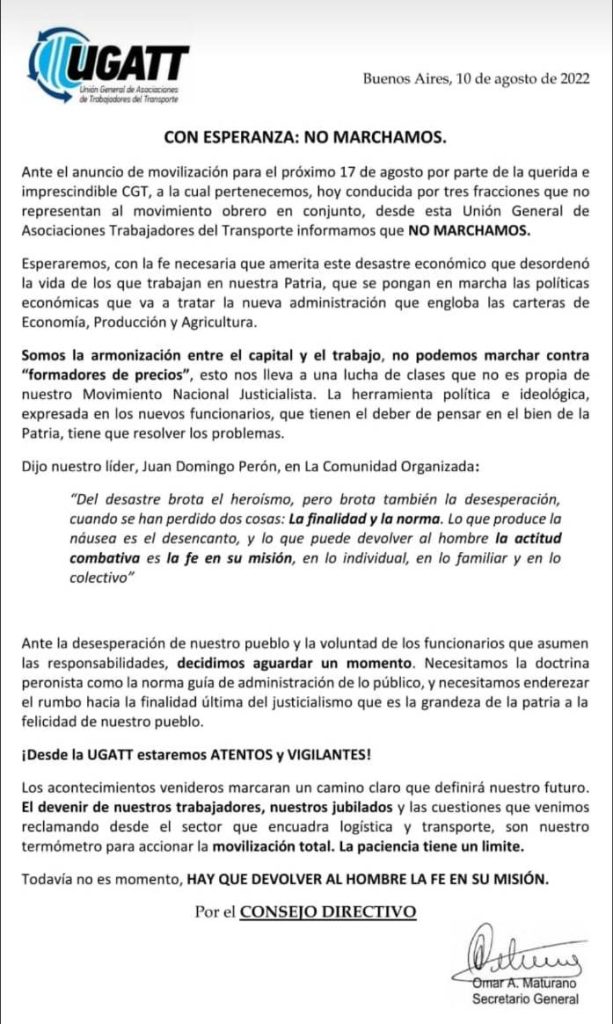 “Con Esperanza: no marchamos”, es el título del comunicado de prensa que en la mañana del miércoles llegó por parte de la conducción de Omar Maturano. Que por cierto, encabeza su texto con palos para todos lados, principalmente a la CGT y las “tres facciones que no representan al movimiento obrero en conjunto”.
