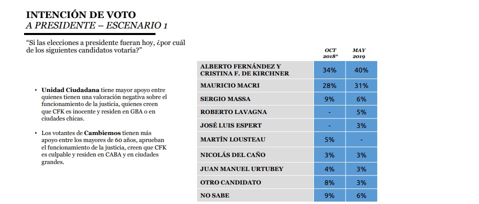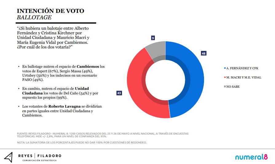 “En un hipotético escenario de balotaje entre Fernández-Fernández y Macri acompañado por Vidal, la diferencia entre ambas fuerzas sería de apenas 5 puntos ya que Unidad Ciudadana obtendría 48% de los votos, comparado con el 43% que votaría a Cambiemos y 9% que no sabe. El estudio arroja que 40% tiene una imagen positiva de Alberto Fernández, 41% tienen una imagen negativa y que aún 19% de los encuestados no lo conoce”, mientras que R&F agrega que “ese último número podría significar una oportunidad de crecimiento para lograr los puntos necesarios para que Unidad Ciudadana gane en primera vuelta”.