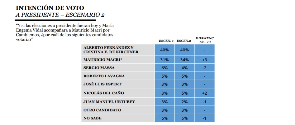 Según un relevamiento privado en aras de la proximidad de un nuevo escenario electoral en la Argentina, la formula que encabeza Alberto Fernández y Cristina Kirchner, tiene amplias ventajas y posibilidades de imponerse en primera vuelta con un nivel de aprobación del 40% por sobre el 31 de Mauricio Macri. Una eventual dupla con María Eugenia Vidal en la boleta, solo le aportaría tres puntos más al Jefe de Estado, en su camino hacia la reelección.