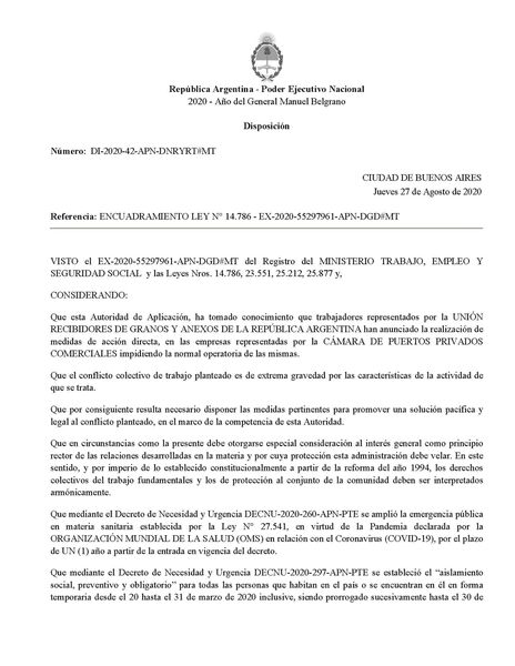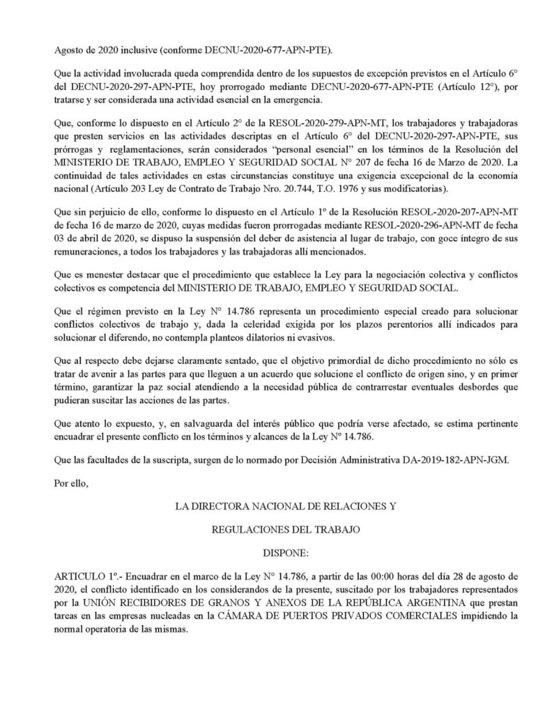 Tras el anuncio de un paro de 36 horas desde la Unión de Recibidores de Granos y Anexos de la República Argentina ante la negativa de la Cámara de Puertos Privados de abrir la negociación paritaria, vencida desde el 30 de junio del 2020 el Ministerio de Trabajo fijó la Conciliación obligatoria.