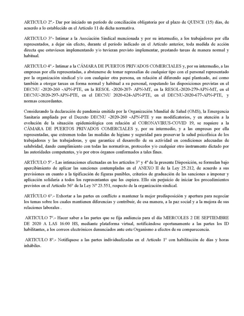 En este marco, desde el gremio que conduce Pablo Palacio, explicaron: “Fracasada la audiencia citada para el jueves 27 de agosto por el Ministerio de trabajo, y no llegando a ponerse de acuerdo las partes, se nos dictó la conciliación obligatoria para la medida anunciada para la rama de Puertos Privados que arrancaba este viernes 00 hs”.