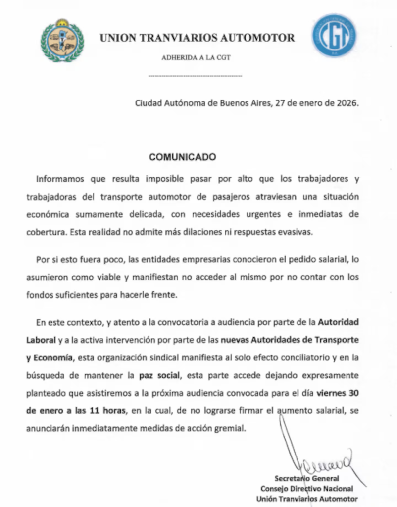 En ese marco, y “al solo efecto conciliatorio” y en la búsqueda de mantener la paz social, la UTA confirmó su participación en una nueva audiencia convocada para el viernes 30 de enero a las 11 horas, pero dejó una advertencia clara: si en ese encuentro no se logra firmar el aumento salarial, se anunciarán inmediatamente medidas de acción gremial.