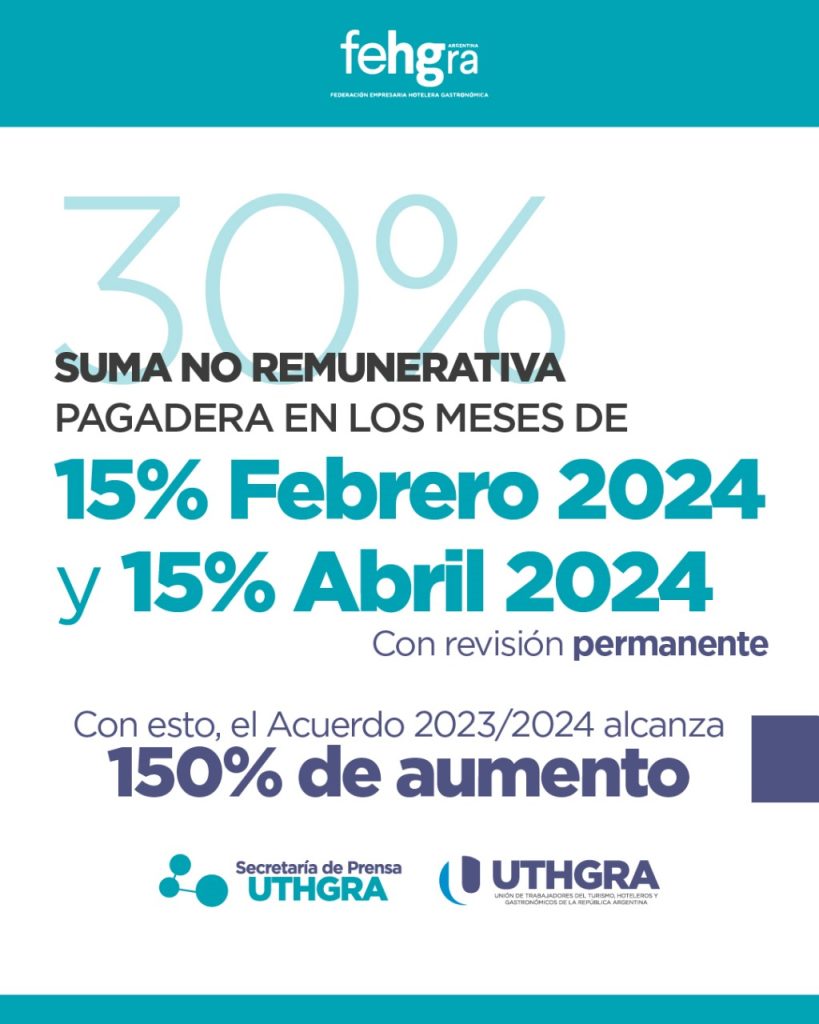 Barrionuevo llegó a un acuerdo con los empresarios de abonar al sector hotelero y gastronómico una suma que se aplicará no remunerativa (hasta mayo de 2024 que se incorpora al Básico) del 30% y que se agrega al acuerdo ya pactado durante el año y que se repartirá en dos tramos. Primero, las empresas deberán pagar una cuota de 15% con el salario de febrero 2024, para luego sumar el segundo tramo de 15% en abril de 2024.